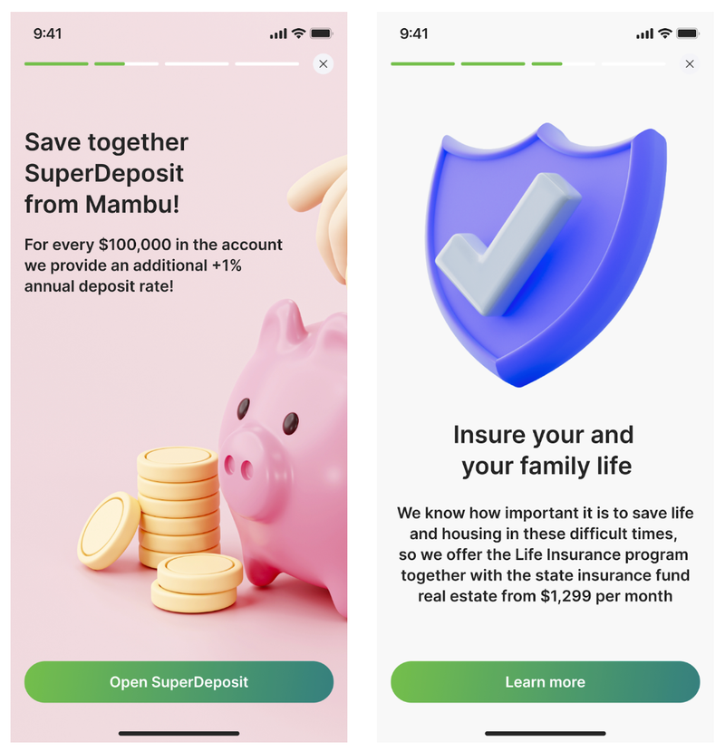 Easily configure any products in Mambu. Allow users to discover a wide range of personalized financial products tailored to their current needs.
