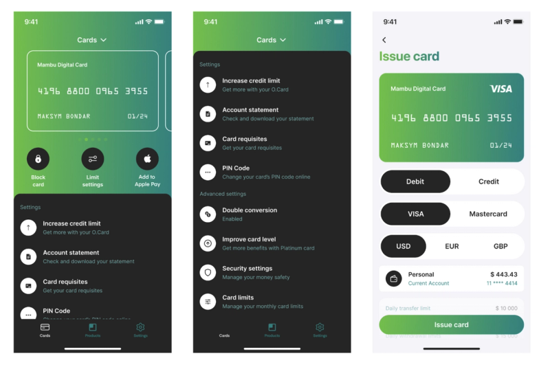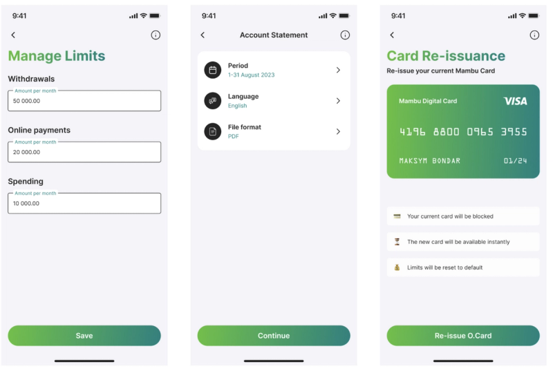Also, Mambu allows the setup and change of pin-code, CVV-code, block, and unblock the card at any time.