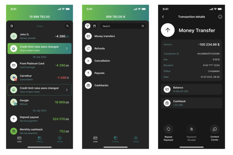 Clients can have full control over their credit and debit cards with the intuitive card management features, easily get account statements, set spending limits, and manage card security.