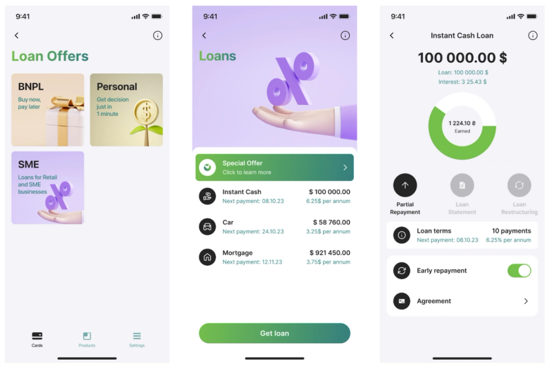 Installment, cash-to-card, cash-to-account, consumer loans, mortgages, overdrafts, credit limits, and other types of loans are supported.