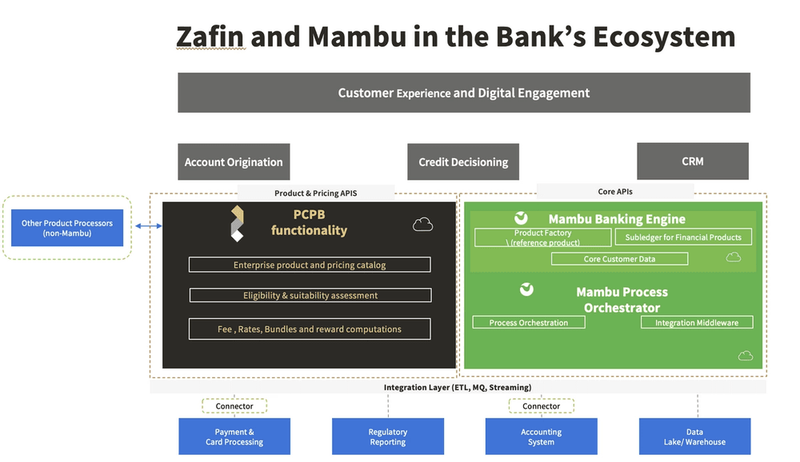 The Zafin platform augments core processing by including a modern layer dedicated to product and pricing that enables digital transformation, customer centricity, and deliver personalisation at the relationship level. Acting as the Product Master, Zafin is able to integrate data from multiple cores, including deposit, LOS and Credit Cards